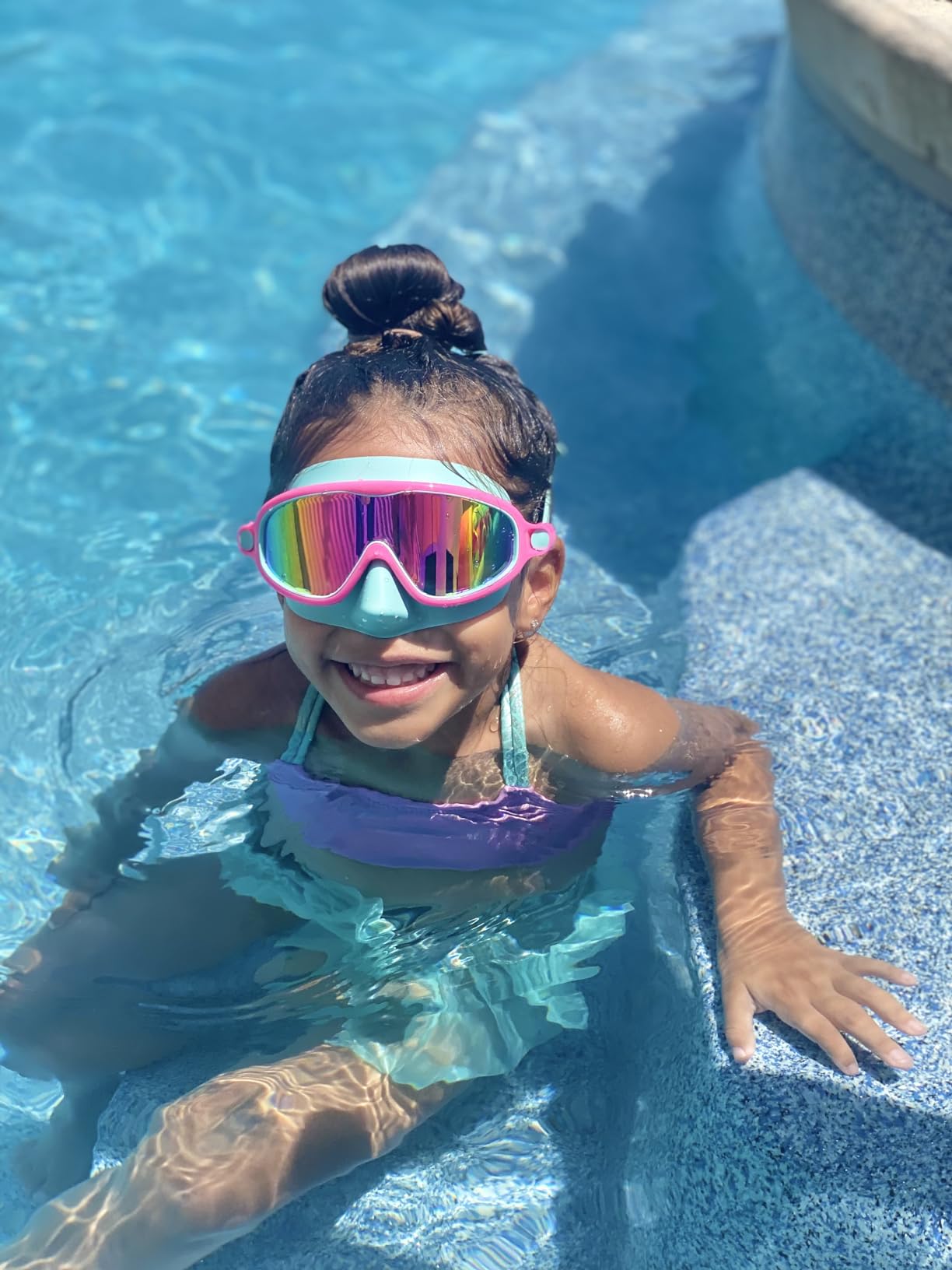 They’re easy to adjust, I love that they can just clip so it’s easy for my kids to put on, take off , and adjust independently. They aren’t obnoxiously bulky like other goggles with nose covers, and flexible so easy to just throw into a small bag and go. We bring them anywhere we might go swimming.